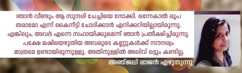 ഞാന് വീണ്ടും ആ സുന്ദരി ചേച്ചിയെ നോക്കി. ഒന്നേകാല് രൂപ തരാമോ എന്ന് കൈനീട്ടി ചോദിക്കാന് എനിക്കറിയില്ലായിരുന്നു. എങ്കിലും, അവര് എന്നെ സഹായിക്കുമെന്ന് ഞാന് പ്രതീക്ഷിച്ചു. പക്ഷേ മഷിയെഴുതിയ അവരുടെ കണ്ണുകള്ക്ക് സൗന്ദര്യം മാത്രമേ ഉണ്ടായിരുന്നുള്ളു. അതിനുള്ളില് അലിവ് ഒട്ടും കണ്ടില്ല.