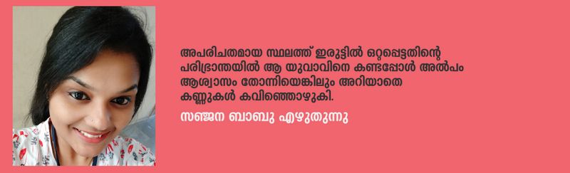 അപരിചതമായ സ്ഥലത്ത് ഇരുട്ടില് ഒറ്റപ്പെട്ടതിന്റെ പരിഭ്രാന്തയില് ആ യുവാവിനെ കണ്ടപ്പോള് അല്പം ആശ്വാസം തോന്നിയെങ്കിലും അറിയാതെ കണ്ണുകള് കവിഞ്ഞൊഴുകി.