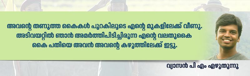 അവന്റെ തണുത്ത കൈകള് പുറകിലൂടെ എന്റെ മുകളിലേക്ക് വീണു. അടിവയറ്റില് ഞാന് അമര്ത്തിപിടിച്ചിരുന്ന എന്റെ വലതുകൈ കൈ പതിയെ അവന് അവന്റെ കഴുത്തിലേക്ക് ഇട്ടു. ഒരു ചെറിയ പത്തുരൂപ ടോര്ച്ചിന്റെ വെളിച്ചത്തില് ഞങ്ങള് ക്യാമ്പിലെ അധ്യാപകര് താമസിക്കുന്ന മുറിയിലേക്ക് നടന്നു. വേദന കലശലായപ്പോഴൊക്കെ ഞാന് അവന്റെ കൈയില് അമര്ത്തി പിടിക്കുന്നുണ്ടായിരുന്നു. അപ്പോഴെല്ലാം അവന്റെ കൈകള് എന്റെ വയറില് പതുകെ കൊട്ടുന്നുണ്ടായിരുന്നു.