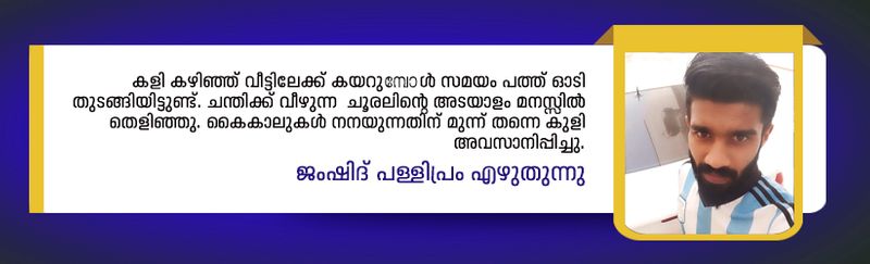 കളി കഴിഞ്ഞ് വീട്ടിലേക്ക് കയറുമ്പോള് സമയം പത്ത് ഓടി തുടങ്ങിയിട്ടുണ്ട്. ചന്തിക്ക് വീഴുന്ന ചൂരലിന്റെ അടയാളം മനസ്സില് തെളിഞ്ഞു. കൈകാലുകള് നനയുന്നതിന് മുന്ന് തന്നെ കുളി അവസാനിപ്പിച്ചു.