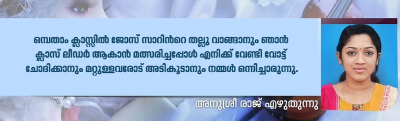 പിന്നീടെപ്പോളോ പറഞ്ഞു നീ മഠത്തിൽ നിന്നാണ് പഠിക്കുന്നത് എന്ന്. നിന്റെ ചിരിയും കളിയും നിറഞ്ഞ ഈ പെരുമാറ്റങ്ങള്ക്കുമപ്പുറം ആരും കാണാത്ത കണ്ണീർ കഥകൾ ഉണ്ടെന്ന്. ജീവിതത്തിൽ ഒരുപാട് കഷ്ടപ്പാടുകൾ നീ സഹിച്ചു എന്ന്.. എങ്കിലും ചിരിച്ച മുഖത്തോടെ അല്ലാതെ നിന്നെ ഞാൻ ഒരിക്കലും കണ്ടിട്ടില്ല. നീയും ഞാനും അഞ്ജലിയും പിന്നെ പ്രജിഷ എന്നോ മറ്റോ പേരുള്ള ഒരു കുട്ടിയും ആയിരുന്നു ഗ്യാങ്.. നമ്മൾ നാല് പേരും ചേർന്ന് ഒരു ക്രിസ്മസ് കാലത്ത് ക്രിസ്തുമസ് ഫ്രണ്ട് ഇട്ടു. അന്ന് നീ എനിക്ക് തന്ന ഒരു ഷീറ്റിൽ നീ തുന്നിയ ഒരു പാവക്കുട്ടി.. അതിപ്പോഴും എന്റെ മനസ്സിൽ ഉണ്ട്.