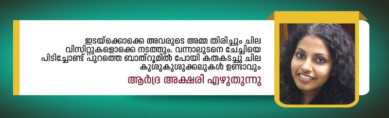 അവരങ്ങ് പോയാൽ രജനിചേച്ചി അതും പറഞ്ഞ് കണ്ണു നിറയ്ക്കും. എന്റെയും കുഞ്ചുവിന്റെയും 'ചേച്ചിയമ്മേ..' വിളികളൊന്നും അപ്പോൾ മാത്രം ഏശില്ല.