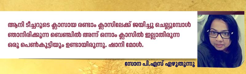 ആനി ടീച്ചറുടെ ക്ലാസായ രണ്ടാം ക്ലാസിലേക്ക് ജയിച്ചു ചെല്ലുമ്പോള് ഞാനിരിക്കുന്ന ബെഞ്ചില് അന്ന് ഒന്നാം ക്ലാസില് ഇല്ലാതിരുന്ന ഒരു പെണ്കുട്ടിയും ഉണ്ടായിരുന്നു. ഷാനി മോള്. അപരിചിത്വം ഇല്ലാതെ അവളെന്നോട് ചിരിച്ചു.