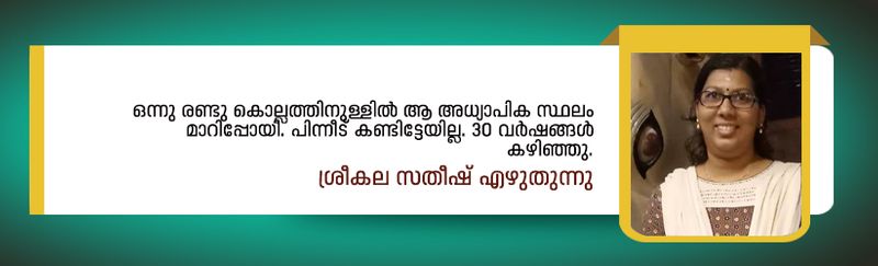ഹോ! ഇത്ര ദൂരത്തു നിന്നോ?' ജില്ലയുടെ അറ്റത്തു താമസിക്കുന്ന ഞങ്ങൾ കുട്ടികൾക്ക് അന്ന് കോട്ടയം വളരെ ദൂരത്തായിരുന്നു. എന്തായാലും പതുക്കെപ്പതുക്കെ അവർ ഞങ്ങളുടെ പ്രിയപ്പെട്ട അധ്യാപികയായി.