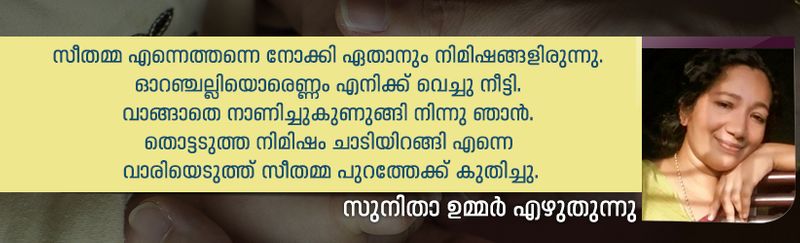 പക്ഷേ, കുറേ ദിവസങ്ങളായി സീതമ്മ എന്റെ മനസ്സിലൂടെ തലങ്ങും വിലങ്ങും നടക്കുന്നു! തരില്ല ഞാനെന്നലറിക്കൊണ്ട് എന്നെയുമെടുത്ത് പായുന്നു! മറ്റേതോ കാലത്തിൽ നിന്നൊഴുകിയെത്തുന്ന ഒരു നിലവിളി എന്നെ ശ്വാസം മുട്ടിയ്ക്കുന്നു.