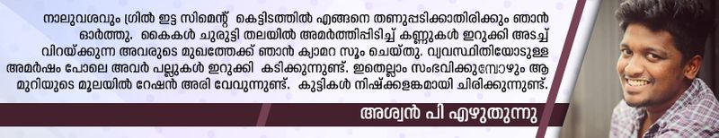 ആ മുറിയുടെ മൂലയില് റേഷന് അരി വേവുന്നുണ്ട്. കുട്ടികള് നിഷ്ക്കളങ്കമായി ചിരിക്കുന്നുണ്ട്.
