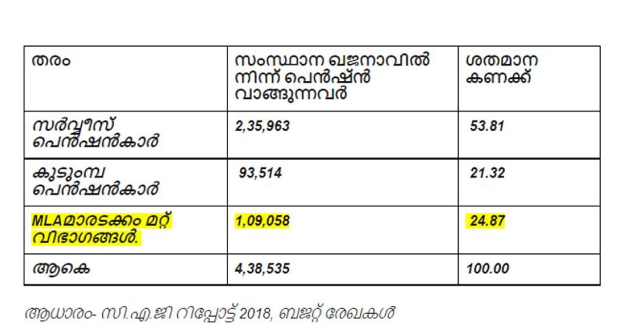 നമ്മുടെ പെന്ഷനാനുകൂല്യം നല്കുന്നതില് നാലിലൊന്നും പോകുന്നതും എം.എല്.ഏമാര്ക്കും അവരുടെ അനുചര വൃന്ദങ്ങള്ക്കും നല്കാനാണ്. ഓരോ വര്ഷവും ശരാശരി 15 ശതമാനത്തോളം ശമ്പള ഇനത്തില് വര്ദ്ധന വരുകയാണ്. പെന്ഷന് ഇനത്തിലുള്ള വാര്ഷിക ശരാശരി വര്ദ്ധനവാകട്ടെ 20 ശതമാനത്തിലും മുകളിലാണ്. ശമ്പള പരിഷ്കാരം നടപ്പാക്കുന്ന വര്ഷങ്ങളില് ഇത് 50 ശതമാനത്തോളം കൂടുകയാണ് പതിവ്.