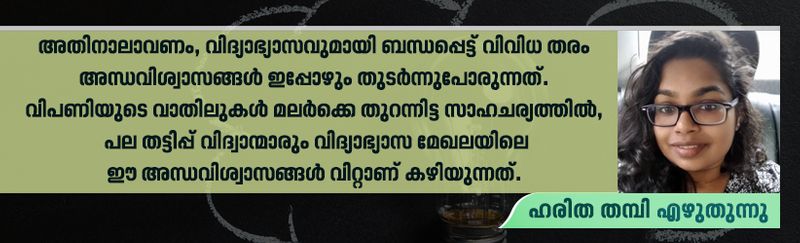 അതിനാലാവണം, വിദ്യാഭ്യാസവുമായി ബന്ധപ്പെട്ട് വിവിധ തരം അന്ധവിശ്വാസങ്ങള് ഇപ്പോഴും തുടര്ന്നുപോരുന്നത്. വിപണിയുടെ വാതിലുകള് മലര്ക്കെ തുറന്നിട്ട സാഹചര്യത്തില്, പല തട്ടിപ്പ് വിദ്വാന്മാരും വിദ്യാഭ്യാസ മേഖലയിലെ ഈ അന്ധവിശ്വാസങ്ങള് വിറ്റാണ് കഴിയുന്നത്. നമ്മുടെ പഠനരീതികളുമായി ബന്ധപ്പെട്ട അത്തരം ചില അന്ധവിശ്വാസങ്ങളുടെ ശാസ്ത്രീയ വശം എന്താണെന്ന പരിശോധന ആണിത്: