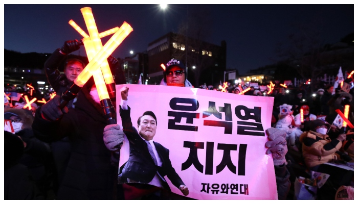 (പ്രസിഡന്റ് യൂൺ സോക് യോളിനെ അനുകൂലിച്ച് സമരം ചെയ്യുന്നവര്)