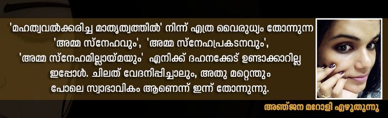 അതുകൊണ്ട് തന്നെ 'മഹത്വവല്ക്കരിച്ച മാതൃത്വത്തില്' നിന്ന് എത്ര വൈരുധ്യം തോന്നുന്ന 'അമ്മ സ്നേഹവും', 'അമ്മ സ്നേഹപ്രകടനവും', 'അമ്മ സ്നേഹമില്ലായ്മയും' എനിക്ക് ദഹനക്കേട് ഉണ്ടാക്കാറില്ല ഇപ്പോള്. ചിലത് വേദനിപ്പിച്ചാലും, അതു മറ്റെന്തും പോലെ സ്വാഭാവികം ആണെന്ന് ഇന്ന് തോന്നുന്നു.