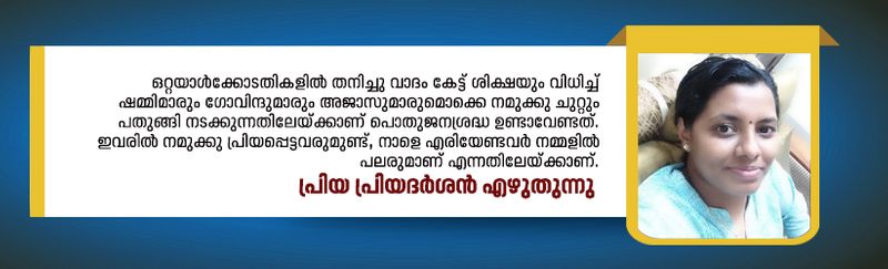 ഇഴഞ്ഞു നീങ്ങുന്നതെങ്കിലും നിലവിലുള്ള നിയമ വ്യവസ്ഥയിലല്ലാതെ മറ്റൊന്നിലും ഒരു പരിഷ്കൃത സമൂഹത്തിന് വിശ്വാസമര്പ്പിക്കാനാവില്ല. പ്രതികളെ സമാന രീതിയിലോ അതിലും ഭീകരമായോ കൊല ചെയ്യുന്നതിലേയ്ക്കല്ല. ഒറ്റയാള്ക്കോടതികളില് തനിച്ചു വാദം കേട്ട് ശിക്ഷയും വിധിച്ച് ഷമ്മിമാരും ഗോവിന്ദുമാരും അജാസുമാരുമൊക്കെ നമുക്കു ചുറ്റും പതുങ്ങി നടക്കുന്നതിലേയ്ക്കാണ് പൊതുജനശ്രദ്ധ ഉണ്ടാവേണ്ടത്. ഇവരില് നമുക്കു പ്രിയപ്പെട്ടവരുമുണ്ട്, നാളെ എരിയേണ്ടവര് നമ്മളില് പലരുമാണ് എന്നതിലേയ്ക്കാണ്.