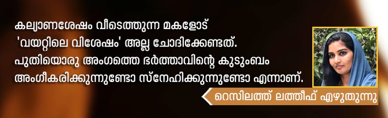 കല്യാണശേഷം വീടെത്തുന്ന മകളോട് 'വയറ്റിലെ വിശേഷം' അല്ല ചോദിക്കേണ്ടത്. പുതിയൊരു അംഗത്തെ ഭര്ത്താവിന്റെ കുടുംബം അംഗീകരിക്കുന്നുണ്ടോ സ്നേഹിക്കുന്നുണ്ടോ എന്നാണ്. നിനക്കോ നീ കാരണമായോ സങ്കടങ്ങളുണ്ടോ എന്നാണ് ആരായേണ്ടത്. പോരായ്മകളില് അവള് തിരുത്തപ്പെടണം. അവകാശങ്ങള്ക്ക് അവള് അര്ഹയുമാകണം. വീടിനുള്ളില് കത്തിയെരിയുന്ന അഗ്നിപര്വ്വതങ്ങള് പലതും പൊട്ടിത്തെറിക്ക് മുന്പ് പട്ടിലും പൂവിലും പൊതിഞ്ഞ നൂല്പ്പാവകള് മാത്രമാണ്.
