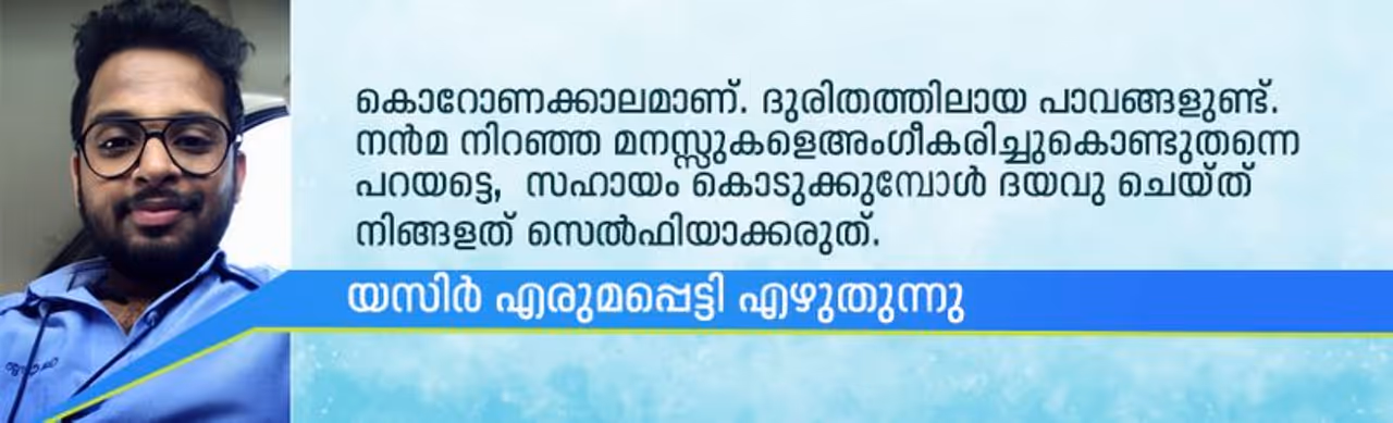 ഇതൊക്കെ ഇപ്പോള് പറയാന് കാര്യമുണ്ട്. കൊറോണക്കാലമാണ്. ദുരിതത്തിലായ പാവങ്ങളുണ്ട്. പട്ടിണിയിലായ കുടുംബങ്ങളുണ്ട്. സഹായം നല്കാന് സന്നദ്ധരായ നല്ല മനുഷ്യരും സംഘടനകളുമുണ്ട്. നന്മ നിറഞ്ഞ ആ മനസ്സ് അംഗീകരിച്ചുകൊണ്ടുതന്നെ നിങ്ങളോട് ഒരു കാര്യം പറയാനുണ്ട്. സഹായം കൊടുക്കുമ്പോള് ദയവു ചെയ്ത് നിങ്ങളത് സെല്ഫിയാക്കരുത്. മറ്റുള്ളവര്ക്ക് പ്രചോദനം എന്ന ന്യായീകരണം വെച്ച്, ആ ഫോട്ടോകള് ഫേസ്ബുക്കിലും വാട്ട്സാപ്പിലും നിറയ്ക്കരുത്.
