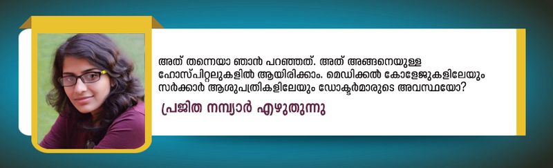 "ഈ മെഡിക്കൽ കോളേജിലെ ഹൗസ് സര്ജന് മുതല് ഡിഎം ചെയ്തോണ്ടിരിക്കുന്ന സീനിയർ റെസിഡന്റൻസ് വരെ പട്ടിയെ പോലെ പണിയെടുക്കുന്നത് കണ്ടിട്ടുണ്ടോ?"