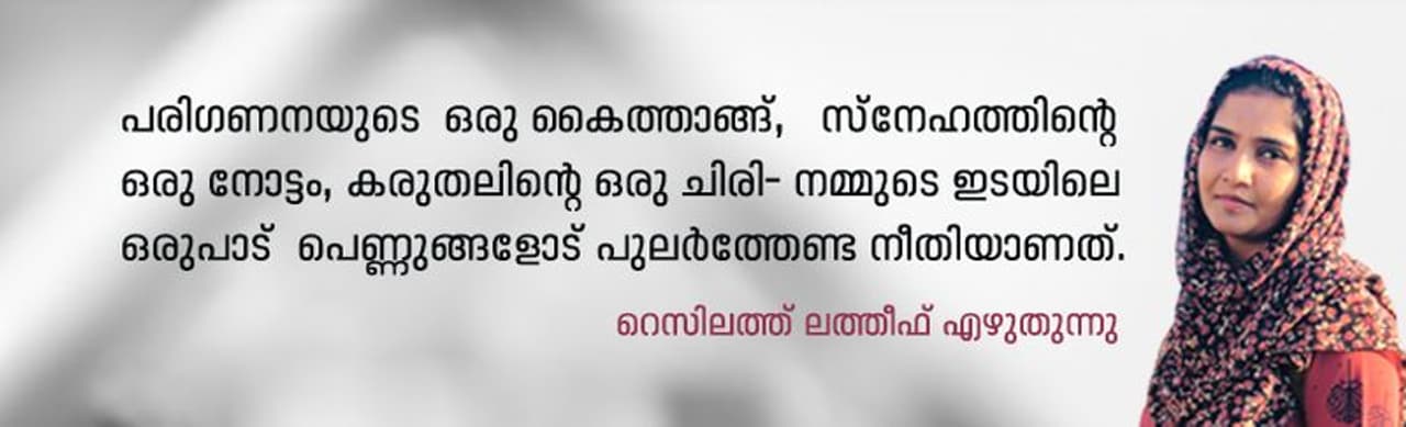 പരിഗണനയുടെ ഒരു കൈത്താങ്ങ്, സ്നേഹത്തിന്റെ ഒരു നോട്ടം, കരുതലിന്റെ ഒരു ചിരി -നമ്മുടെ ഇടയിലെ ഒരുപാട് പെണ്ണുങ്ങളോട് പുലര്ത്തേണ്ട നീതിയാണത്. എന്നെ ഇഷ്ടമായോ എന്ന ചോദ്യത്തില് തുടങ്ങുന്ന ജീവിത കരാറില് പിന്നീടൊരുപാട് ഇഷ്ടങ്ങള് ചോദിക്കണം; പറയണം. അത് ചായയാണോ കാപ്പിയാണോ കൂടുതല് ഇഷ്ടം എന്ന് മാത്രമല്ല, മുണ്ടുടുക്കുന്നതാണോ പാന്റാണോ കൂടുതല് പ്രിയമെന്നു മാത്രമല്ല, എന്റെ കൂടെ ഈ കിടപ്പറയില് നീ സന്തോഷമായിരിക്കുന്നോ എന്ന് കൂടി ചോദിച്ചു തുടങ്ങുമ്പോ മറ്റെല്ലാം മാറിത്തുടങ്ങും .