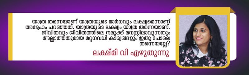 യാത്ര തന്നെയാണ് യാത്രയുടെ മാര്ഗവും ലക്ഷ്യമെന്നാണ് അദ്ദേഹം പറഞ്ഞത്. യാത്രയുടെ ലക്ഷ്യം യാത്ര തന്നെയാണ്. ജീവിതവും ജീവിതത്തിലെ നമുക്ക് മനസ്സിലാവുന്നതും അല്ലാത്തതുമായ മറ്റനവധി കാര്യങ്ങളും ഇതു പോലെ തന്നെയല്ലേ? ജീവിക്കുന്നത് ജീവിക്കാന് വേണ്ടിതെന്നയാണ്. അതിന്റെ അര്ത്ഥവും ജീവിതവും തന്നെയാണ്. കടല് കാണാന് മറ്റിടങ്ങളുള്ളപ്പോഴും നമ്മള് വിദൂര ദേശങ്ങളില് വന്ന് വലിയ മലകള് വലിഞ്ഞു കയറി ഉന്നതശൃംഗങ്ങളില്നിന്നും കടലു കാണുന്നതും ഇതു കൊണ്ടു തന്നെ. അതിലേക്കുള്ള യാത്ര. അതിന്റെ ത്രില്. മറ്റെവിടെനിന്നും കാണാനാവാത്തതു പോലെ കടലിന്റെ അതിമനോഹരമായ കാഴ്ചയില് ചെന്നു വീഴാനുള്ള സാദ്ധ്യത.