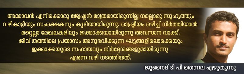 അമ്മാവന് എനിക്കൊരു ജ്യേഷ്ടന് മാത്രമായിരുന്നില്ല നല്ലൊരു സുഹൃത്തും വഴികാട്ടിയും സംരക്ഷകനും കൂടിയായിരുന്നു. രാഷ്ട്രീയം ഒഴിച്ച് നിര്ത്തിയാല് മറ്റെല്ലാ മേഖലകളിലും ഇക്കാക്കയായിരുന്നു അവസാന വാക്ക്. ജീവിതത്തിലെ പ്രയാസം അനുഭവിക്കുന്ന ഘട്ടങ്ങളിലൊക്കെയും ഇക്കാക്കയുടെ സഹായവും നിര്ദ്ദേശങ്ങളുമായിരുന്നു എന്നെ വഴി നടത്തിയത്. അലിഗഢില് പി ജിക്ക് അഡ്മിഷന് കിട്ടിയപ്പോള് സംസ്ഥാനത്തിന് പുറത്തേക്ക് പറഞ്ഞയക്കാന് മടിച്ച വീട്ടുകാര്ക്ക് മുന്നില് എനിക്കായി വാതിലുകള് തുറന്നിട്ടതും മാമന് തന്നെയായിരുന്നു. നാട്ടിലെ സാംസ്കാരിക സംഘടനയുടെ ഭാഗമായി പരിസ്ഥിതി പ്രശ്നങ്ങളിലും കൊലപാതക കേസിലും അടക്കം സജീവമായി ഇടപെടാന് തുടങ്ങിയ സമയത്തും ഇതിന്റെ പേരില് അക്രമികളില് നിന്ന് അടികിട്ടിയ സമയത്തും പ്രതിരോധിക്കാനും സംരക്ഷിക്കാനുമുണ്ടായിരുന്നത് നാട്ടുകാരോ പോലീസോ ആയിരുന്നില്ല, എന്റെ ഈ തൊട്ടപ്പനായിരുന്നു. എന്റെ പൊതുജീവിതത്തിലും സ്വകാര്യ ജീവിതത്തിലും ഒരേപോലെ പകരം വെക്കാനില്ലാത്ത ഗോഡ് ഫാദറാണ് ഈ വല്ല്യേട്ടന്.