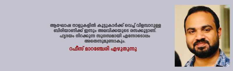 പ്രവാസം അവസാനിപ്പിച്ച് കുടുംബത്തോടൊപ്പം വിശ്രമ ജീവിതം നയിച്ച് നാട്ടില് കഴിയുന്ന അലവിക്കയെ ഇടയ്ക്കിടെ വിളിച്ചും നാട്ടില് ചെല്ലുമ്പോള് വളാഞ്ചേരിയില് പോയി കണ്ടും ഇന്നും ബന്ധം തുടരുന്നു. ആഘോഷ നാളുകളില് കൂട്ടുകാര്ക്ക് വെച്ച് വിളമ്പാറുള്ള ബിരിയാണിക്ക് ഇന്നും അലവിക്കയുടെ രസക്കൂട്ടാണ്. ഹൃദയം നിറക്കുന്ന സുഗന്ധമായി എന്നോടൊപ്പം അതെന്നുമുണ്ടാകും.