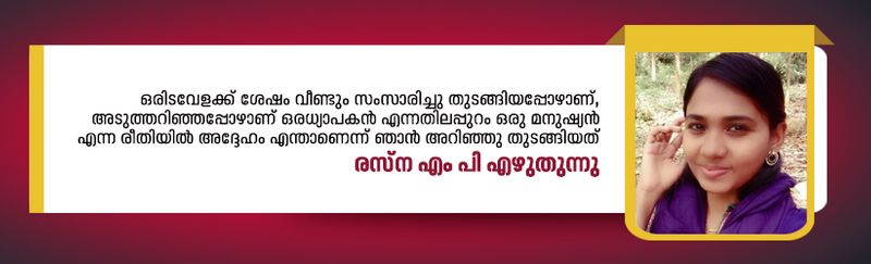 ഒരിടവേളക്ക് ശേഷം വീണ്ടും സംസാരിച്ചു തുടങ്ങിയപ്പോഴാണ്, അടുത്തറിഞ്ഞപ്പോഴാണ് ഒരധ്യാപകന് എന്നതിലപ്പുറം ഒരു മനുഷ്യന് എന്ന രീതിയില് അദ്ദേഹം എന്താണെന്ന് ഞാന് അറിഞ്ഞു തുടങ്ങിയത്. തല തിരിഞ്ഞ ചിന്തകളും, എണ്ണിയാലൊടുങ്ങാത്ത സംശയങ്ങളുമായി, ചെരുപ്പ് പോലുമിടാതെ ഫറൂഖ് കോളേജിന്റെ വരാന്തയിലൂടെ നടന്നു നീങ്ങിയിരുന്ന ആ ഭ്രാന്തന് കാലത്തെക്കുറിച്ചൊരിക്കല് സര് വാചാലനായപ്പോള് ഞാനത് ശരിക്കും മനക്കണ്ണാല് കണ്ടു.