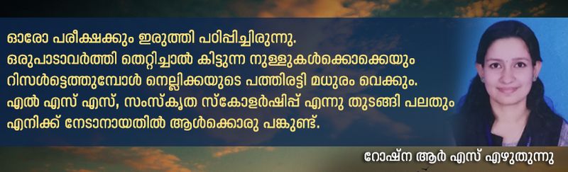 ഓരോ പരീക്ഷക്കും ഇരുത്തി പഠിപ്പിച്ചിരുന്നു. ഒരുപാടാവര്ത്തി തെറ്റിച്ചാല് കിട്ടുന്ന നുള്ളുകള്ക്കൊക്കെയും റിസള്ട്ടെത്തുമ്പോള് നെല്ലിക്കയുടെ പത്തിരട്ടി മധുരം വെക്കും. എല് എസ് എസ്, സംസ്കൃത സ്കോളര്ഷിപ്പ് എന്നു തുടങ്ങി പലതും എനിക്ക് നേടാനായതില് ആള്ക്കൊരു പങ്കുണ്ട്.