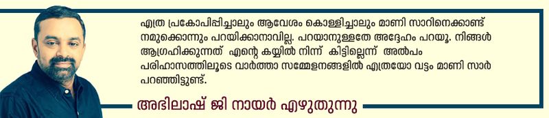 ഇതാണ് മാണി സാര്. കാലവും സമയവും നേരത്തെ കുറിച്ച് വെച്ചു കരുക്കള് നീക്കുന്നതില് അഗ്രഗണ്യന്. അഭിലാഷ് ജി നായര് എഴുതുന്നു