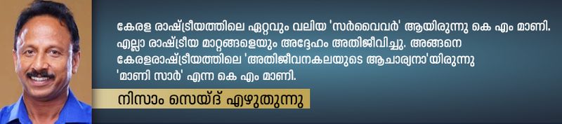 കേരള രാഷ്ട്രീയത്തിലെ ഏറ്റവും വലിയ 'സര്വൈവര്' ആയിരുന്നു കെ എം മാണി. എല്ലാ രാഷ്ട്രീയ മാറ്റങ്ങളെയും അദ്ദേഹം അതിജീവിച്ചു. അങ്ങനെ കേരളരാഷ്ട്രീയത്തിലെ 'അതിജീവനകലയുടെ ആചാര്യനാ'യിരുന്നു 'മാണി സാര്' എന്ന കെ എം മാണി.