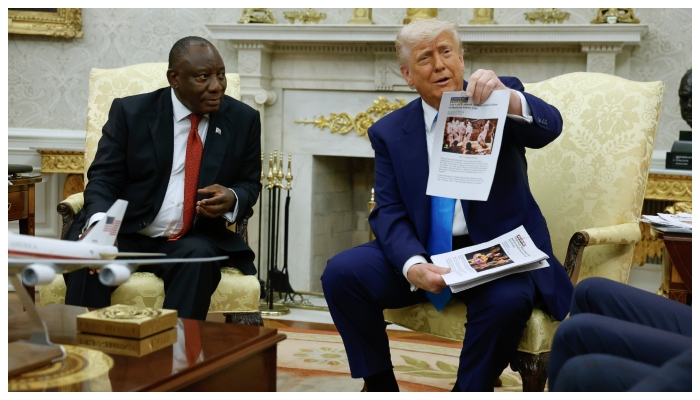 (ട്രംപും സിറിൾ രാമഫോസയും വൈറ്റ് ഹൗസില് വച്ച് നടന്ന ചര്ച്ചയ്ക്കിടെ)