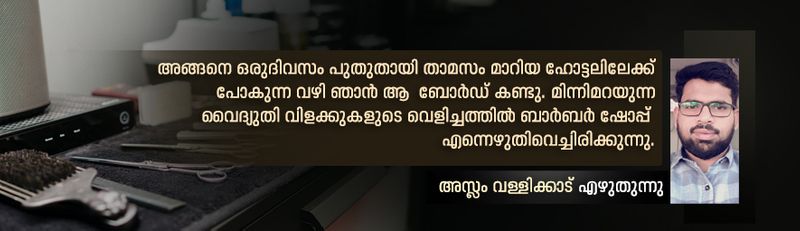 അങ്ങനെ ഒരു ദിവസം പുതുതായി താമസം മാറിയ ഹോട്ടലിലേക്ക് പോകുന്ന വഴി ഞാൻ ആ ബോര്ഡ് കണ്ടു. മിന്നിമറയുന്ന വൈദ്യുതി വിളക്കുകളുടെ വെളിച്ചത്തില് 'ബാര്ബര് ഷോപ്പ്' എന്നെഴുതിവെച്ചിരിക്കുന്നു. പാതി മരിച്ച എന്റെ സൗന്ദര്യബോധം വീണ്ടും തളിര്ത്ത് തുടങ്ങി. പ്രവൃത്തി ദിവസങ്ങളിലെ തിരക്കുകള് തീര്ത്ത് വാരാന്ത്യത്തില്, അച്ചടക്കമില്ലാതെ പാറിക്കളിക്കുന്ന മുടിയും സ്കൂള് അസംബ്ലിയില് എത്ര ശ്രമിച്ചാലും വരിതെറ്റി നില്കുന്ന വികൃതിക്കുട്ടിയെപോലെ കൂട്ടം തെറ്റി നടക്കുന്ന താടിയും ഒന്ന് വെട്ടി ഒതുക്കാന് തന്നെ ഞാന് തീരുമാനിച്ചു.