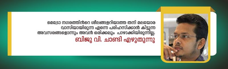 മെട്രോ നഗരത്തിന്റെ ശീലങ്ങളറിയാത്ത തനി മലയോര വാസിയായിരുന്ന എന്നെ പരിഹസിക്കാൻ കിട്ടുന്ന അവസരങ്ങളൊന്നും അവൻ ഒരിക്കലും പാഴാക്കിയിരുന്നില്ല. ഷൂ പോളീഷ് ചെയ്യാത്തതിന്, കറുത്ത ഷൂവിനൊപ്പം ബ്രൗൺ ബെൽറ്റ് ധരിച്ചതിന്, കളർ സെൻസില്ലാതെ വസ്ത്രം ധരിക്കുന്നതിനുമൊക്കെ...