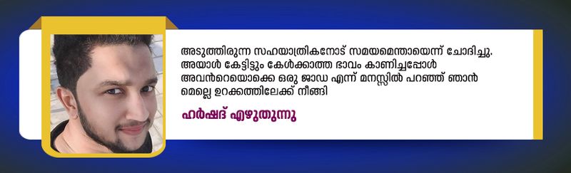 അടുത്തിരുന്ന സഹയാത്രികനോട് സമയമെന്തായെന്ന് ചോദിച്ചു. അയാള് കേട്ടിട്ടും കേൾക്കാത്ത ഭാവം കാണിച്ചപ്പോൾ അവന്റെയൊക്കെ ഒരു ജാഡ എന്ന് മനസ്സിൽ പറഞ്ഞ് ഞാൻ മെല്ലെ ഉറക്കത്തിലേക്ക് നീങ്ങി. എയർഹോസ്റ്റസ് കുടിക്കാനുള്ള വെള്ളവുമായി വന്നപ്പോൾ പെട്ടെന്ന് ഞെട്ടി ഉണർന്നു. വെള്ളം കുടിക്കുമ്പോൾ ആ സഹയാത്രികൻ എന്നോട് മോന്റെ പേരെന്താ, നാടെവിടെയാ, എവിടെ ജോലിചെയ്യുന്നു എന്നൊക്കെ ചോദിച്ചു. എല്ലാത്തിനും മറുപടി പറഞ്ഞതിന് ശേഷം ഞാൻ അയാളോട് പറഞ്ഞു നിങ്ങളൊരു പ്രവാസിയല്ലേ നാട്ടിലേക്ക് പോകുമ്പോഴെങ്കിലും ഈ ഗൗരവം മാറ്റി ചിരിക്കാൻ ശ്രമിച്ചു കൂടെ എന്ന്. അയാളുടെ മുഖത്തെ ഗൗരവം വീണ്ടും കൂടിയത് കൊണ്ട് തന്നെ ഞാൻ കണ്ണടച്ച് കിടന്നു. അപ്പൊ തന്നെ അയാൾ എന്നെ തട്ടി വിളിച്ചു പറഞ്ഞു, 'മോനെ, നിന്റെ പ്രായത്തിൽ ഒരുപാട് ചിരിച്ചും കളിച്ചും നടന്നിട്ടുള്ളവനാ ഞാൻ. പക്ഷെ, ഇപ്പോ ചിരിക്കാൻ പറ്റിയ സാഹചര്യമല്ല. കാരണം 19 വർഷത്തെ ജയിൽവാസം കഴിഞ്ഞ് നാട്ടിലേക്കു പോകുന്നവനാണ് ഞാൻ.' ഇത്രയും കേട്ടപ്പോൾ തന്നെ പേടിച്ച് എഴുന്നേറ്റു പോയാലോ എന്ന് തോന്നി. എന്റെ മുഖഭാവം കണ്ടത് കൊണ്ടാവണം അയാൾ തുടർന്നു, 'ചെറുപ്പത്തിൽ എല്ലാ സുഖസൗകര്യങ്ങളോടും കൂടിയാണ് ഞാൻ ജീവിച്ചത്. എന്റെ അച്ഛൻ എനിക്ക് എല്ലാം ചെയ്തു തന്നു.'