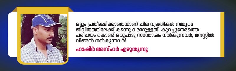 ഒട്ടും പ്രതീക്ഷിക്കാതെയാണ് ചില വ്യക്തികൾ നമ്മുടെ ജീവിതത്തിലേക്ക് കടന്നു വരാറുള്ളത്. കുറച്ചുനേരത്തെ പരിചയം കൊണ്ട് ഒരുപാടു സന്തോഷം നൽകുന്നവർ, മനസ്സിൽ വിങ്ങൽ നൽകുന്നവർ. പ്രവാസത്തിന്റെ ഒഴുക്കിൽ പലരെയും നാം മനപ്പൂർവമല്ലെങ്കിൽ കൂടി മറവിയുടെ ചവറ്റുകുട്ടയിലേക്ക് വലിച്ചെറിയാറുണ്ട്. തിരക്കുകളുടെ, ടെൻഷന്റെ ഇടയിൽ സംഭവിച്ചു പോകുന്നതാണത്. എന്നാൽ, കേവലം 20-25 മിനുട്ടിൽ തീർത്ത സംസാരത്തിലൂടെ എന്റെ മനസ്സിലിന്നും തിളങ്ങി നിൽക്കുന്ന ഒരു വ്യക്തിയുണ്ട്. പ്രവാസത്തിന്റെ മറവികളിലേക്ക് ഞാൻ വലിച്ചെറിയാത്ത, ആൾക്കൂട്ടത്തിൽ ഇന്നും തിരയുന്ന ഒരു മുഖമുണ്ട്. ഓർക്കുമ്പോൾ വേദനയും സന്തോഷവും നിറഞ്ഞ സമ്മിശ്രമായ വികാരമുണർത്തുന്ന ഒരു വ്യക്തിത്വം.