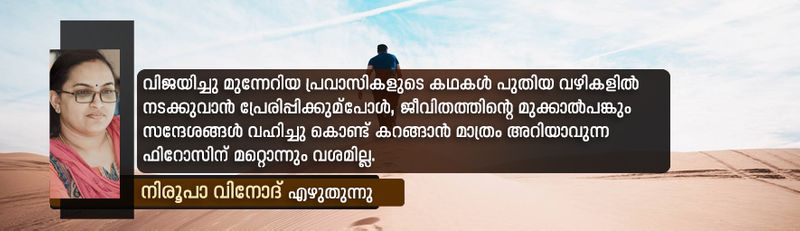 വിജയിച്ചു മുന്നേറിയ പ്രവാസികളുടെ കഥകൾ പുതിയ വഴികളിൽ നടക്കുവാൻ പ്രേരിപ്പിക്കുമ്പോൾ, ജീവിതത്തിന്റെ മുക്കാൽപങ്കും സന്ദേശങ്ങൾ വഹിച്ചു കൊണ്ട് കറങ്ങാൻ മാത്രം അറിയാവുന്ന ഫിറോസിന് മറ്റൊന്നും വശമില്ല. അതിനിടയ്ക്കെപ്പോഴോ അയാൾ വിവാഹിതനായി, മക്കളുണ്ടായി, അയാൾ പോലുമറിയാതെ അവർ വളർന്നു.