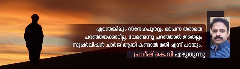 എന്തെങ്കിലും പൈസ തരാതെ പറഞ്ഞയക്കാറില്ല. വേണ്ടെന്നു പറഞ്ഞാൽ, സ്നേഹത്തോടെ 'ഇതെല്ലാം സൂപ്പർവിഷൻ ചാർജ് ആയി കണ്ടാൽ മതി' എന്ന് പറയും. ആയിടക്കാണ് അദ്ദേഹം എന്റെ വീടിനെ കുറിച്ച് ചോദിച്ചറിയുന്നത്. കുറെ വര്ഷമായിമായി വീടൊന്നും പണിയാൻ കഴിഞ്ഞിട്ടില്ല. ഇപ്പോഴും പഴയ ഒരു വീടുണ്ട് അതിലാണ് താമസം. അന്ന് ഏകദേശം 12 വര്ഷത്തോളമായിരുന്നു പ്രവാസി ആയിട്ട്. ഇത്രനാൾ ആയിട്ടും ഒരു വീട് വെക്കാൻ പറ്റാത്തതിന്റെ സങ്കടം ഉള്ളിലുണ്ടായിരുന്നു.