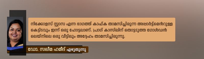 നിക്കോളസ് സ്റ്റാസ എന്ന ഭാഗത്ത് കാഫ്ക താമസിച്ചിരുന്ന അപ്പാർട്ട്മെൻറുള്ള കെട്ടിടവും ഇന്ന് ഒരു ഹോട്ടലാണ്. പ്രാഗ് കാസിലിന് തൊട്ടടുത്ത ഗോൾഡൻ ലെയ്നിലെ ഒരു വീട്ടിലും അദ്ദേഹം താമസിച്ചിരുന്നു. അവിടെ ഇന്ന് കാണുന്ന ഷോപ്പിൽ നിന്ന് കാഫ്കയുടെ കൃതികൾ വാങ്ങാം. ഇവിടെ വച്ചാണ് കൺട്രിഡോക്ട്ർ എന്ന കഥ എഴുതുന്നത് . 35 വയസുള്ളപ്പോൾ തൊണ്ടയിൽ ക്ഷയരോഗബാധിതനായ അദ്ദേഹം ഏഴ് വർഷം തന്റെ രോഗവുമായി മല്ലിട്ടു. ക്ഷയരോഗം പൂർണമായി ചികിത്സിച്ച് മാറ്റാൻ ശക്തിയുള്ള മരുന്നുകൾ അക്കാലത്ത് കണ്ടു പിടിച്ചിട്ടുണ്ടായില്ല. കുറേക്കാലം ആൽപ്സ് പർവത നിരകളിലെ ഒരു TB സാനട്ടോറിയത്തിൽ താമസിച്ചാണ് കാലം കഴിച്ചത് . സൂര്യ പ്രകാശമേൽക്കലും പ്രത്യേക രീതിയിലുള്ള സസ്യഭക്ഷണവുമായിരുന്നു ചികിത്സ. ദുരിതപൂർണമായ ഇതേ കാലത്ത് അദ്ദേഹം കുറിച്ചിട്ട സൂക്തങ്ങളുടെ ശേഖരം മാക്സ് പ്രസിദ്ധീകരിച്ചു. അവയിലൊന്ന്- “I am a cage in search of a bird''