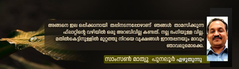 അങ്ങനെ ഇല ഒപ്പിക്കാനായി തപ്പിനടന്നപ്പോഴാണ് ഞങ്ങൾ താമസിക്കുന്ന ഫ്ലാറ്റിന്റെ വഴിയിൽ ഒരു അറബിവില്ല കണ്ടത്. നല്ല ഭംഗിയുള്ള വില്ല. മതിൽകെട്ടിനുള്ളിൽ മുറ്റത്തു നിറയെ വൃക്ഷങ്ങൾ ഈന്തപ്പനയും മാവും ഞാവലുമൊക്കെ. ഏറെ ഉയരമില്ലാത്ത മതിലിലൂടെ മരക്കൊമ്പുകൾ പുറത്തേക്ക് എത്തിനോക്കുന്നു. നാലുചുറ്റും മതിലുള്ള വീടിന്റെ പുറകുവശത്തായി കുറേ വാഴകൾ. അവയുടെ ഇലകൾ പുറത്തേക്ക് നോക്കി എന്നെ കൈമാടി വിളിക്കുന്നു.