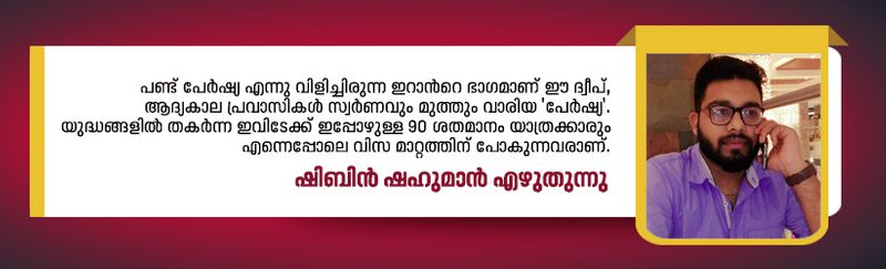 പണ്ട് പേർഷ്യ എന്നു വിളിച്ചിരുന്ന ഇറാന്റെ ഭാഗമാണ് ഈ ദ്വീപ്. ആദ്യകാല പ്രവാസികൾ സ്വർണവും മുത്തും വാരിയ 'പേർഷ്യ'. യുദ്ധങ്ങളിൽ തകർന്ന ഇവിടേക്ക് ഇപ്പോഴുള്ള 90 ശതമാനം യാത്രക്കാരും എന്നെപ്പോലെ വിസ മാറ്റത്തിന് പോകുന്നവരാണ്.