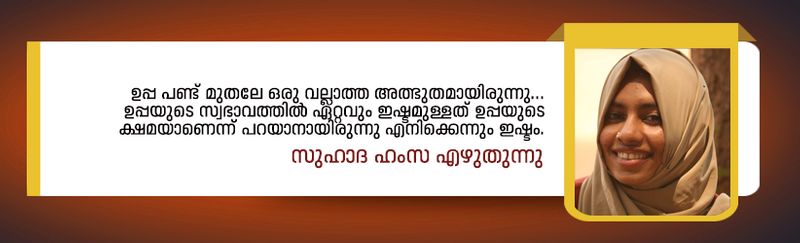 ഉപ്പ പണ്ട് മുതലേ ഒരു വല്ലാത്ത അത്ഭുതമായിരുന്നു... ഉപ്പയുടെ സ്വഭാവത്തിൽ ഏറ്റവും ഇഷ്ടമുള്ളത് ഉപ്പയുടെ ക്ഷമയാണെന്ന് പറയാനായിരുന്നു എനിക്കെന്നും ഇഷ്ടം. പക്ഷെ, ചുട്ടുപൊള്ളുന്ന വെയിലത്ത് മരുഭൂമിയിൽ അറബിയുടെ ചീത്തയും വീട്ടുകാരുടെ പരാതിയും തീർക്കാൻ കാണിച്ച ആത്മാർത്ഥയാണ് അതെന്ന് മനസിലാക്കാൻ എനിക്ക് പത്തൊൻപത് കൊല്ലങ്ങൾ വേണ്ടി വന്നു.