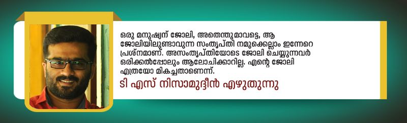 ഒരു മനുഷ്യന് ജോലി, അതെന്തുമാവട്ടെ, ആ ജോലിയിലുണ്ടാവുന്ന സംതൃപ്തി നമുക്കെല്ലാം ഇന്നേറെ പ്രശ്നമാണ്. അസംതൃപ്തിയോടെ ജോലി ചെയ്യുന്നവര് ഒരിക്കല്പ്പോലും ആലോചിക്കാറില്ല. എന്റെ ജോലി എത്രയോ മികച്ചതാണെന്ന്. 12 വര്ഷത്തെ പത്രപ്രവര്ത്തന ജീവിതത്തിനു താല്ക്കാലിക വിരാമമിട്ട്, ഗള്ഫിലേക്കു പറന്ന എനിക്ക്, പുതിയ ജോലിയോട് പൊരുത്തപ്പെട്ടുവരുന്നതിനിടെയാണ് ആ യുവാവിന്റെ 'പ്രഫഷനലിസം' നേരിട്ട് അനുഭവിക്കാനായത്. അവന് എനിക്കു നല്കിയ പാഠം ചെറുതല്ല. പുതിയ മേഖലയിലെ പുത്തന് അറിവുകള് മനസ്സിലാവാതെ വരുമ്പോള്, വിഷമിക്കുമ്പോള് എന്റെ മനസ്സില് തെളിയുന്നത് അവന്റെ മുഖമാണ്, 'സര്.. ഏക് മിനിറ്റ്' എന്ന ധ്വനിയും..
