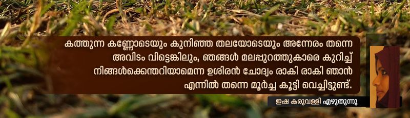 കത്തുന്ന കണ്ണോടെയും കുനിഞ്ഞ തലയോടെയും അന്നേരം തന്നെ അവിടം വിട്ടെങ്കിലും, ഞങ്ങൾ മലപ്പുറത്തുകാരെ കുറിച്ച് നിങ്ങൾക്കെന്തറിയാമെന്ന ഉശിരൻ ചോദ്യം രാകി രാകി ഞാൻ എന്നിൽ തന്നെ മൂർച്ച കൂട്ടി വെച്ചിട്ടുണ്ട്. വിഷു അടക്കമുള്ള വിശേഷ ദിനങ്ങളിലെല്ലാം കുന്നുംപുറത്തെ ഉമ്മ വീട്ടിൽ ഞങ്ങൾ മക്കളും പേരമക്കളുമെല്ലാം ഒത്തു കൂടിയിരുന്നത് അപ്പുറത്തെ വിലാസിനി ചേച്ചിയുടെ വീട്ടിൽ നിന്നും എത്തുന്ന സദ്യ മോഹിച്ചിട്ടു തന്നെയായിരുന്നു. അപ്രതീക്ഷിത സമയത്തൊരഥിതി കേറി വന്നാൽ മൂന്നാലു പത്രങ്ങളുമായി ഉമ്മുമ്മ അപ്പുറത്തെ വീട്ടിലേക്ക് ഞങ്ങൾ കുട്ടികളെ ഓടിച്ചിരുന്നത്, ഉള്ളത് തരുന്നൊരു കുടുംബം ജാതി മത വേലിക്കെട്ടിനപ്പുറം ഉണ്ടെന്ന ഉറപ്പുള്ളത് കൊണ്ടായിരുന്നു. അജ്മൽ കസബിനെ തൂക്കിലേറ്റിയ വാർത്ത വായിച്ച് ഹറാം പിറന്നത് കാണിച്ചിട്ടല്ലേ ചെറുപ്പത്തിലേ പോകേണ്ടി വന്നതെന്ന് മാത്രമാണ് പൊതുവെ ലോലഹൃദയനായ ഉപ്പുപ്പാ പോലും പറഞ്ഞു കേട്ടിട്ടുള്ളത്.