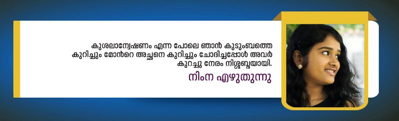 പണി കഴിഞ്ഞു തിരിച്ചു പോകവെ വെള്ളം കുടിക്കാനായി ഒരു ദിവസം അവർ വീട്ടിൽ കയറി വന്നു. കുശലാന്വേഷണം എന്ന പോലെ ഞാൻ കുടുംബത്തെ കുറിച്ചും മോന്റെ അച്ഛനെ കുറിച്ചും ചോദിച്ചപ്പോൾ അവർ കുറച്ചു നേരം നിശ്ശബ്ദയായി.