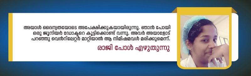അയാൾ ദൈന്യതയോടെ അപേക്ഷിക്കുകയായിരുന്നു. ഞാൻ പോയി ഒരു ജൂനിയർ ഡോക്ടറെ കൂട്ടിക്കൊണ്ട് വന്നു. അവർ അയാളോട് പറഞ്ഞു വെന്റിലേറ്റർ മാറ്റിയാൽ ആ നിമിഷമവൾ മരിക്കുമെന്ന്. മറുപടിയൊന്നും പറയാതെ കുനിഞ്ഞ ശിരസ്സോടെ അയാളിറങ്ങിപ്പോയി. പിറ്റേദിവസം അവൾ മരിച്ചു. ഞാൻ ഡ്യൂട്ടിയിലുണ്ടായിരുന്നു. അവളുടെ മരണം സ്ഥിരീകരിച്ചതായി അറിയിക്കാൻ ഡോക്ടർമാർ അയാളെ വിളിച്ചു വരുത്തി. കാണാനും അധികം ആരുമുണ്ടായിരുന്നില്ല. ഫോർമാലിറ്റികളൊക്കെ പൂർത്തിയാക്കി വൃത്തിയാക്കി ഞങ്ങളവളെ വെള്ള പുതപ്പിൽ പൊതിഞ്ഞു. അവളുടെ റിപ്പോർട്ടുകളും ബാക്കി പേപ്പറുകളുമൊക്കെ കൈമാറുമ്പോൾ ഒരിക്കലും കരഞ്ഞ് കണ്ടിട്ടില്ലാത്ത അയാൾ വിതുമ്പുന്നുണ്ടായിരുന്നു.