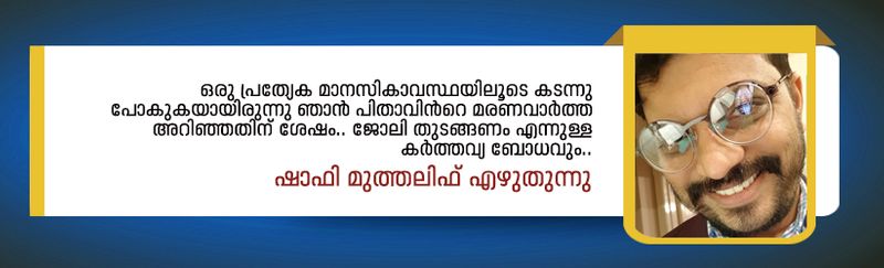 ജോലിയുടെ ആദ്യത്തെ ദിനം തന്നെ അദ്ദേഹം ചോദിച്ചു,‘ഷാഫി, നിന്റെ അച്ഛൻ മരിച്ചതായി അറിഞ്ഞു, നിനക്ക് നാട്ടിൽ പോകണമോ?' ഞാൻ പറഞ്ഞു, "വേണ്ട, ചടങ്ങും കാര്യങ്ങളും ഒക്കെ കഴിഞ്ഞു." പക്ഷേ, എനിക്ക് അപ്പോഴും അറിയാമായിരുന്നില്ല, എനിക്ക് പോകാൻ കഴിയുമോ? ഇനി വരുമ്പോൾ ജോലി പോകുമോ എന്നെല്ലാം. ഇതൊക്കെ ശരിയായി ചോദിക്കാവുന്ന ആരും തന്നെ ഉണ്ടായിരുന്നില്ല.