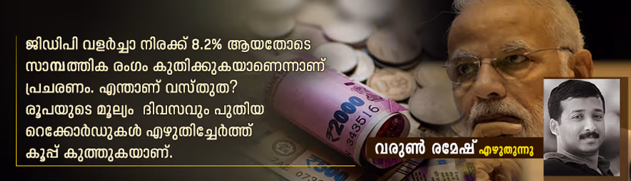 സോഷ്യല് മീഡിയ വാളുകളില് പോസ്റ്റുകളുടെ പ്രളയമാണ്. 'ജിഡിപി വളർച്ചാ നിരക്ക് 8.2% എത്തി, ഭാരതത്തിന്റെ സാമ്പത്തിക നില തിളങ്ങുകയാണ്, നോട്ട് നിരോധനം കൊണ്ടുള്ള ഗുണം രാജ്യത്തെ സാമ്പത്തിക മേഖലയെ ക്ലീനാക്കി, അതുകൊണ്ടാണ് ഇത്രയും വളര്ച്ചാ നിരക്ക് കാണിക്കുന്നത്' ഇതൊക്കെയാണ് വാദം. എന്നാ പിന്നെ ഈ വളർച്ചയ്ക്ക് പിന്നിൽ ഒരു രഹസ്യം കാണുമല്ലോ. അതെന്താണെന്ന് നോക്കാം. പരിശോധിച്ചു. കണ്ടെത്തിയത് ദാ ഇങ്ങനെ ചുരുക്കിപറയാം.