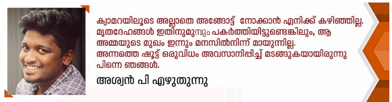 അന്നത്തെ ഷൂട്ട് കഴിഞ്ഞ് മടങ്ങാറായപ്പോൾ ഒരാൾ ഓടിവന്നു പറഞ്ഞു, ഒരു ബോഡി കിട്ടിയിട്ടുണ്ട്. വള്ളത്തിൽ ചുരുണ്ട് കിടക്കുന്ന നിലയിൽ ഒരു വൃദ്ധയുടെതായിരുന്നു മൃതദേഹം. വെള്ളം കൂടി വന്നപ്പോൾ ആരും സഹായിക്കാൻ ഇല്ലായിരുന്ന അവരുടെ മരണത്തെക്കുറിച്ച് ഓർത്തപ്പോൾ ക്യാമറയിലൂടെ അല്ലാതെ അങ്ങോട്ട് നോക്കാൻ എനിക്ക് കഴിഞ്ഞില്ല. മൃതദേഹങ്ങൾ ഇതിനുമുമ്പും പകർത്തിയിട്ടുണ്ടെങ്കിലും, ആ അമ്മയുടെ മുഖം ഇന്നും മനസ്സിൽനിന്ന് മായുന്നില്ല. അന്നത്തെ ഷൂട്ട് ഒരുവിധം അവസാനിപ്പിച്ച് മടങ്ങി.