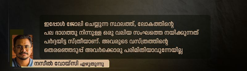 ഇപ്പോള് ജോലി ചെയ്യുന്ന സ്ഥലത്ത്, ലോകത്തിന്റെ പല ഭാഗത്തു നിന്നുള്ള ഒരു വലിയ സംഘത്തെ നയിക്കുന്നത് പര്ദ്ദയിട്ട സ്ത്രീയാണ്. അവരുടെ വസ്ത്രത്തിന്റെ തെരഞ്ഞെടുപ്പ് അവര്ക്കൊരു പരിമിതിയാവുന്നേയില്ല. തട്ടമിട്ടവരും ഇടാത്തവരുമായുള്ളവരൊക്കെ തങ്ങളുടെ ജോലി ചെയ്യുന്നു. ഐക്യരാഷ്ട്ര സംഘടനയുടെ തലപ്പത്തിരിക്കുന്നവരില് ഒരാളായ നൈജീരിയക്കാരി ആമിന മുഹമ്മദ് അവരുടെതായ രീതിയില് തല മറക്കുന്നുണ്ട്. അമേരിക്കന് കോണ്ഗ്രസിലേക്ക് ഈയടുത്ത് തെരഞ്ഞെടുക്കപ്പെട്ട മുസ്ലിം സ്ത്രീകളിലൊരാള് ഹിജാബ് ധരിക്കുന്നയാളാണ്. തട്ടമിട്ടും പര്ദ്ദയിട്ടുമൊക്കെ തന്നെ എന്ട്രന്സില് ഉന്നത റാങ്കുകളും വിദേശ രാജ്യങ്ങളിലടക്കം റിസര്ച് അവസരങ്ങളും കരസ്ഥമാക്കിയ കഥകളൊക്കെ വേറെ. രാജ്യത്തിനകത്തും പുറത്തും നിരന്തരം യാത്ര ചെയ്യുന്ന, സ്വന്തമായി ബിസിനസ് ചെയ്യുന്ന, സോഷ്യല് മീഡിയയുടെ സാധ്യതകള് പരമാവധി ഉപയോഗിക്കുന്ന, എന്ജിഒകള്ക്ക് നേതൃത്വം നല്കുന്ന... അങ്ങനെ ഒരുപാട് പേരെ തൊട്ടടുത്ത് തന്നെ കാണാനുമുണ്ട്.