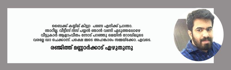 കോടതിപ്പടി ഹമ്പ് കയറുമ്പോ എതിരെ വന്ന വെള്ള അമ്പാസിഡര് കാറിന്റെ കയറ്റി വെച്ച കറുത്ത ഗ്ളാസ്സില് ആണ് ഞാന് ആ മോഹന ദൃശ്യം കാണുന്നത്. ന്റെ തല അവിടെ ഇല്ല. പകരം ചോന്ന കളറുള്ള ഒരു പന്ത്. അഞ്ചാം നമ്പര്. അത് കണ്ടപ്പോള്, ഇത് തന്നെ ബോധം കേടാനുള്ള സമയം ന്നു മനസ്സിലാക്കി ഞാന് പ്ളിന്തനെ അവരുടെ തോളിലേക്ക് ചാരി. പോയി പോയി ബോധം പോയി- രഞ്ജിത്ത് മണ്ണാര്ക്കാട് എഴുതുന്നു
