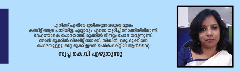 എനിക്ക് എതിരേ ഇരിക്കുന്നവരുടെ മുഖം കണ്ടിട്ട് അത്ര പന്തിയില്ല, എല്ലാരും എന്നെ തുറിച്ച് നോക്കിയിരിപ്പാണ്. ദേഹത്താകെ ചോരയാണ്, മൂക്കില് നിന്നും ചോര വരുന്നുണ്ട്. ഞാന് മൂക്കില് വിരലിട്ട് നോക്കി. സിമ്പിള്, ഒരു മൂക്കീന്നേ ചോരയുള്ളൂ, മറ്റേ മൂക്ക് ഈസ് പെര്ഫെക്റ്റ്ലി ആള്റൈറ്റ്.