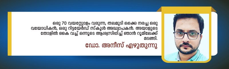 10 വര്ഷം ഒരു പോറല് പോലും എല്പ്പിക്കാതെ ഈ മനുഷ്യന്, വൈദ്യ ശാസ്ത്രം എഴുതി തള്ളിയ സ്വന്തം ഭാര്യയെ ഊണും ഉറക്കവും ഇല്ലാതെ പരിചരിച്ചു കൊണ്ടിരിക്കുന്നു. ഒരിക്കലും തിരിച്ചു വരില്ല എന്ന് അറിഞ്ഞു കൊണ്ട് തന്നെ എന്ന ആ യാഥാര്ത്ഥ്യം എന്നെ ആഴത്തില് സ്പര്ശിച്ചു. ഞാന് അദ്ദേഹത്തിന്റെ തോളില് കൈ വച്ചു കൊണ്ട് പറഞ്ഞു, “അച്ഛാ , പ്രതീക്ഷ കൈ വിടാതെ അങ്ങ് ഈ പരിചരണം തുടരുക, ദൈവത്തോട് പ്രാര്ത്ഥിക്കുക, ഞാനും പ്രാര്ഥിക്കാം.'' കണ്ണില് വന്ന ഈറന് തുടച്ചു അദ്ദേഹം പറഞ്ഞു, ശരി സാറേ..