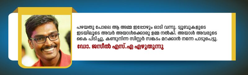 പഴയതു പോലെ ആ അമ്മ ഇപ്പോഴും ഓടി വന്നു. ട്യൂബുകളുടെ ഇടയിലൂടെ അവർ അയാൾക്കൊരു ഉമ്മ നൽകി. അയാൾ അവരുടെ കൈ പിടിച്ചു, കണ്ടുനിന്ന സിസ്റ്റർ സങ്കടം മറക്കാൻ നന്നേ പാടുപെട്ടു.