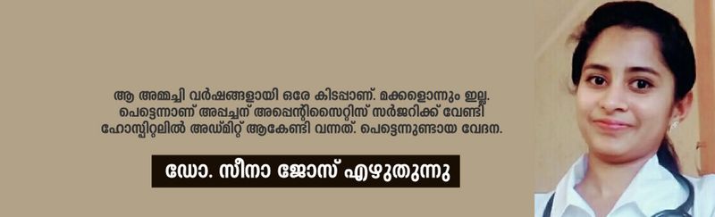 റൂമില് നിന്നും പുറത്തിറങ്ങുമ്പോള് മനസ് നിറയെ ആ അപ്പച്ചനും അമ്മച്ചിയും തന്നെയായിരുന്നു. ആരും ഇല്ലാതെ ഒറ്റക്കായി പോകുന്ന ഒരു രാത്രി നമ്മള്ക്കൊക്കെ ചിന്തിക്കാന് കഴിയുമോ? അസുഖമൊന്നും സാരമില്ല വീട്ടില് പോയാമതിയെന്നു പറഞ്ഞു കൊച്ചുകുട്ടിയെ പോലെ കരഞ്ഞ ആ അപ്പച്ചന് ആശുപത്രി നാളുകളില് ഉറങ്ങിയിട്ടുണ്ടാകുമോ? ഡോ. സീനാ ജോസ് എഴുതുന്നു